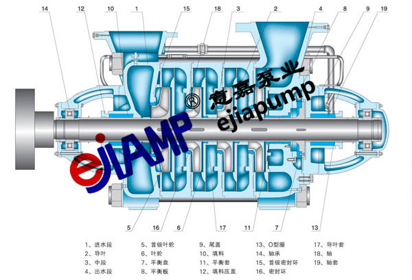 2、D型臥式多級離心泵主要零件有:進水段、中段、出水段、葉輪、導翼擋板、出水段導翼、軸、密封環、平衡環、軸套、尾蓋及軸承體。