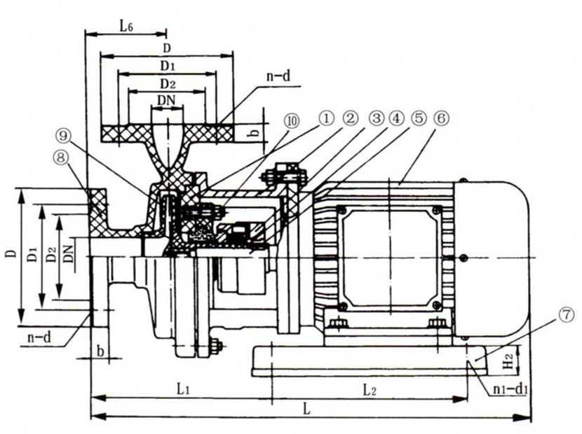 1 泵蓋 2 聯接架 3 機械密封 4 軸套 5 軸承 6 電機 7 底座 8 泵體 9 葉輪 10 密封壓蓋