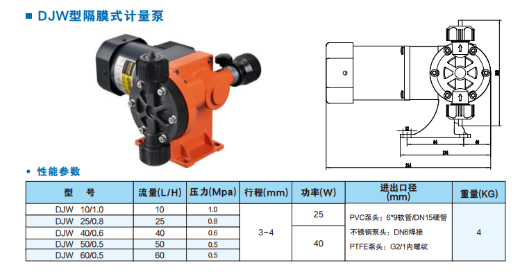 DJ-W型機械隔膜計量泵的性能參數(shù)表: