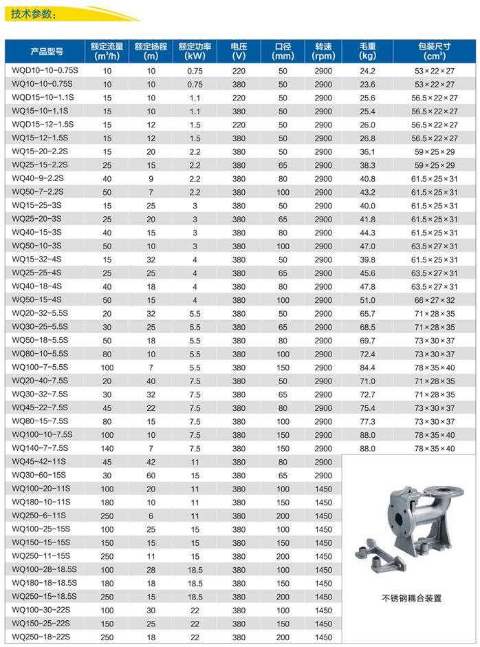 WQ(D)-S全不銹鋼排污泵是上海意嘉泵業制造有限公司生產的主打產品產品之一,采用全不銹鋼精密鑄造、耐高溫電纜、密封圈、機械密封和NSK日本進口高溫軸承來解決液體溫度高達120℃介質的排放問題。可根據用戶要求定制帶攪勻及切割裝置。